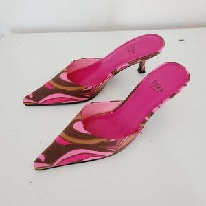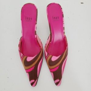 Stylish Impo heels with a vibrant pink and brown swirl design. Perfect for adding flair to any outfit.