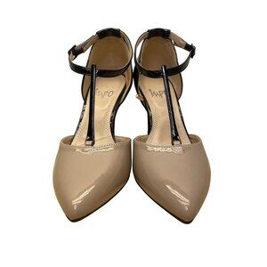 Chic T-strap heels with a patent finish, pointed toe, ankle strap, and 2.5-inch heel. Black and nude colorway for a sleek and timeless look.