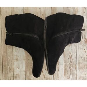 DESCRIPTION: Black flat faux suade ankle boots with zippers and decorative chain on the outside.