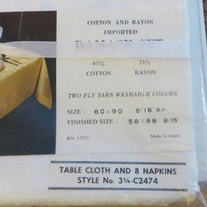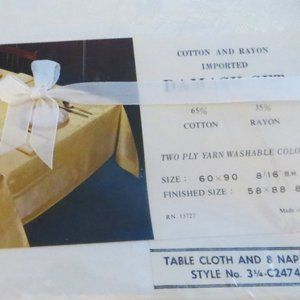 Damask tablecloth and napkin set. New in sealed package, never opened or used. Made of 65 % cotton and 35 % rayon. Two ply, washable. Finished size is 58 inches