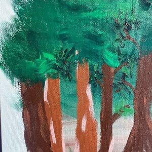 This captivating painting features a lush forest scene with vibrant green foliage and warm brown tree trunks. The impressionistic style, with its bold brushstrokes, adds depth and texture, creating a serene natural atmosphere.