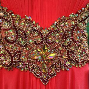 Chiffon strapless, sweetheart ruched bodice with heavily beaded waist and A-line floor length skirt.