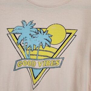 Good Vibes short sleeve tee in peach, featuring a retro design of palm trees at sunset. This crewneck is perfect for summer, made from a comfortable blend of cotton and spandex.