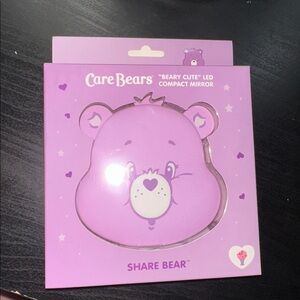 Charming purple compact mirror with LED lighting. Features a cute bear face design. Ideal for quick touch-ups.
