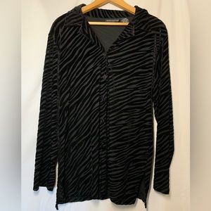This vintage, black zebra-print button up is great for layering over a plain shirt! Keep in mind, the fabric between the zebra stripes is sheer and fairly see through. It has a cute vintage look. The zebra stripes feel velvety and this top has buttons along the whole front.