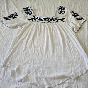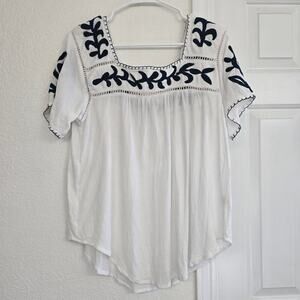 Impressions White Blue Embroidered Boho Short Sleeve Cotton Blend Blouse Size L