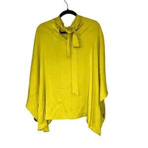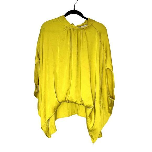 A bold and modern shift-style top in vibrant chartreuse, designed with a relaxed fit, soft silky drape, and subtle sheen. Features short sleeves with a cuffed edge, a round neckline, and a slightly longer back hem for an easy, elevated silhouette. Perfect for styling with denim, trousers, or skirts for a pop of color in any season.