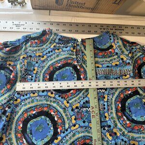 This blouse offers a unique abstract pattern, vibrant colors, and a relaxed fit, making it a standout addition to any wardrobe.