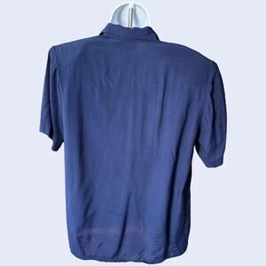 Relaxed camp-collar short-sleeve button shirt in deep navy with a tonal A-monogram chest crest. Drapey, slinky 100% rayon with that soft 90s handfeel. Made in USA. Minimalist/preppy vibe; easy throw-on with denim or trousers. Condition: Good