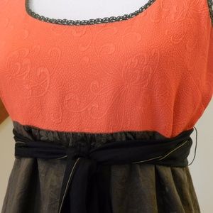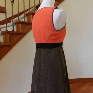 Easy to wear and just beautiful, the imprint dress by Moulinette Soeurs from the July 2007 Anthropologie catalog. Orig $188. Silk jacquard in shades of watermelon & pine gives way to a black cotton-dobby hem. Imported. Classic look. This dress was shortened 1/2 inch at the shoulders and can be let back out. Size 4. 18"B, 14.5"W, 37"L.
