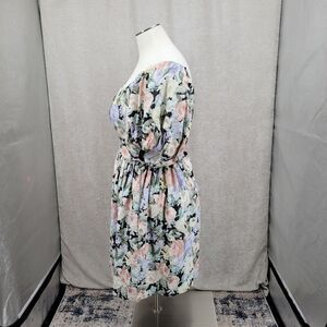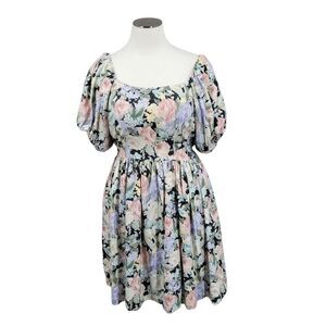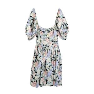 Embrace elegance with this floral puff sleeve dress. It features a beautiful blend of pink, periwinkle, and cream hues on a black background.