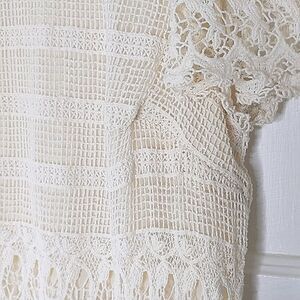 Polyester open-weave ivory lace overlays a full cotton lining. Low scoop back, scalloped hem, short sleeves. Pull-over styling. Excellent used condition, no snags or pulls.