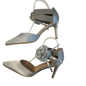 Stylish silvery blue elastic ankle strap satin shoe 3" heel with gorgeous flower fabric accent. Only worn once in excellent used condition.