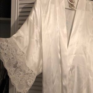 White satin feel material with lace detail on arms and bottom. Baby blue embroidery - “The Bride”. Essentially brand new, worn once on wedding day. Slightly wrinkly from being in closet, but can be ironed I’m sure. Very soft and comfortable.