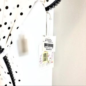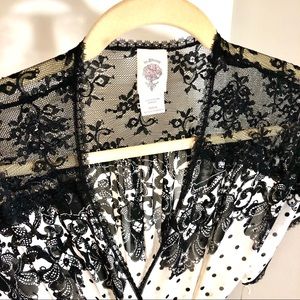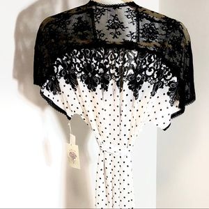 Brand new. Never worn. White & black polka dot robe by In Bloom. Features black lace detail across the shoulders and trim at the bottom, w/ a polka dot print throughout.
