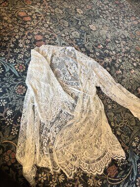 Features intricate floral lace, scalloped edges, and a soft tie waist for an adjustable, flattering fit. Perfect as a layering piece over dresses, swimwear, or styled for that dreamy, vintage-inspired look.