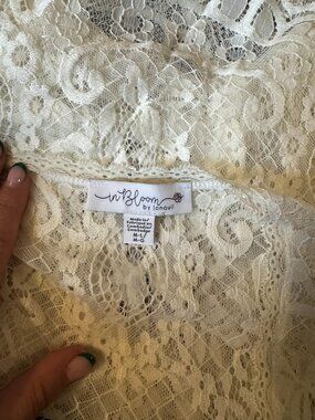 Delicate ivory lace wrap from In Bloom by Jonquil—romantic, feminine, and effortlessly ethereal.