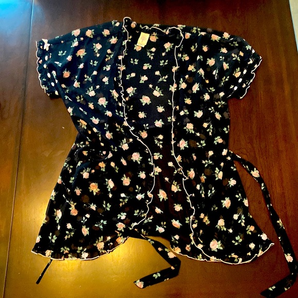 This short sleeve sheer robe is great as a coverup for loungewear or your pajamas. A cute ribbon and bow detail on the sleeves.