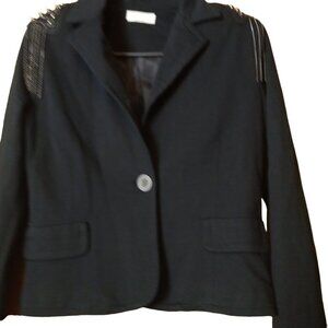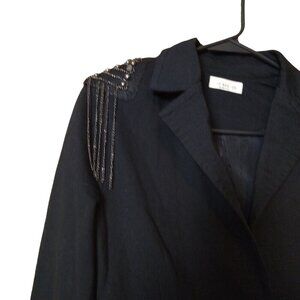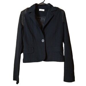 In Box By Be Cool women's Small long sleeve black blazer is made of 100% cotton. It has one button closure, two faux flap front pockets, shoulder pads and beaded chain detailing on the shoulders.