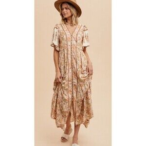 In Loom Boho Floral Midi Dress Cottage Core Dress Prarie Soho Beige Multi Sz S