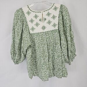 In Loom Floral Blouse Shirt Green Womens Size Small Embroidered Top Peasant D108