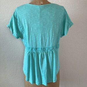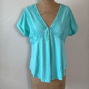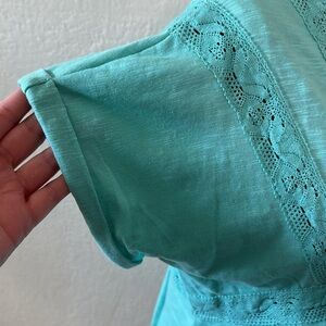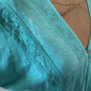 In Loom Small Turquoise Lace Top Short Sleeve Button Detail V-Neck Roll Up Sleeve NWT