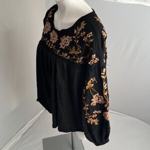 In Loom black multicolor floral embroidered drop sleeve pleated boho blouse. Embroidery on chest and down sleeves. Elastic at cuffs. Excellent condition. Smoke free home