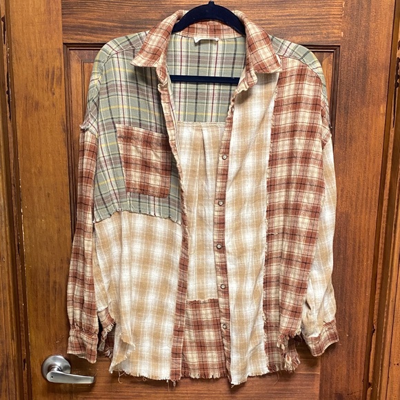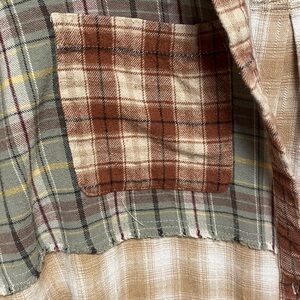 Casual patchwork plaid shirt with beige and olive tones. Distressed at the bottom. Lightweight and ideal for relaxed outings.