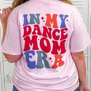 Graphic t-shirt front design features a smiley face with heart and lightning bolt eyes. Along with sparkles and "In my dance mom era". Back of shirt design features "In my dance mom era" in a bold colorful font with sparkles around the design.