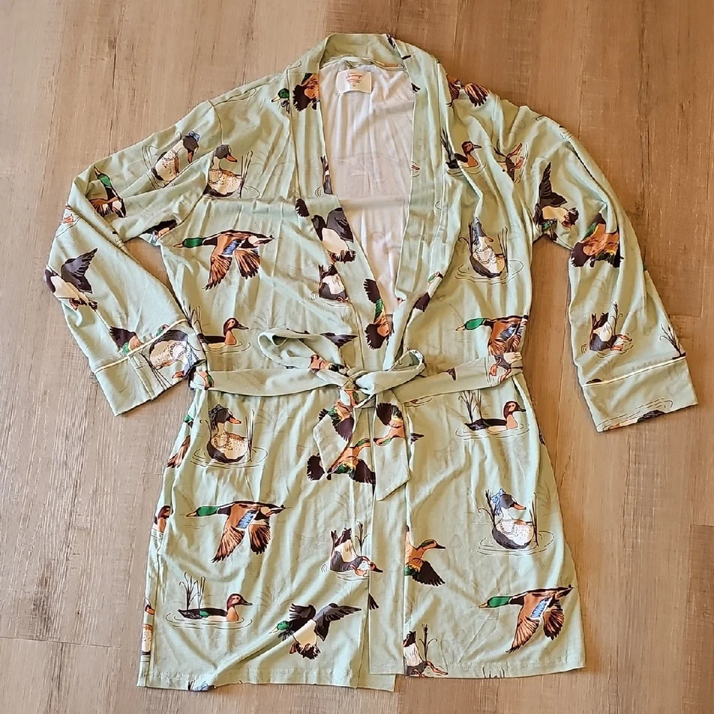 In My Sundays by Mallory Ervin short robe in duck and bow print called fancy fowl, sage green. has pockets, tie strap and loop for hanging up. Like New condition and never been washed.