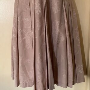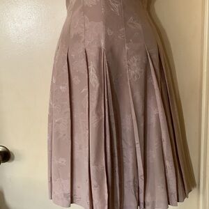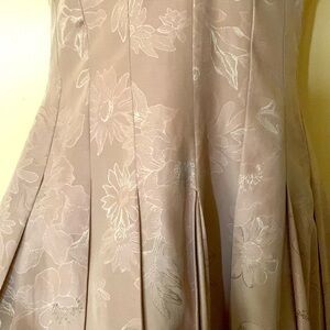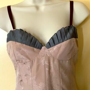 This gorgeous dress is truly one of a kind. It is a luxurious jacquard fabric in a blush pink. Bust line is accented in a denim cotton ruffle. The dress is fully lined in 100% cotton. Corset style ending in pleats all around. Size 4 one strap in loose but can be sewed.