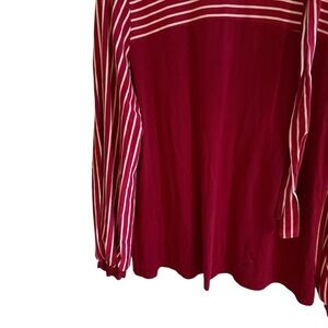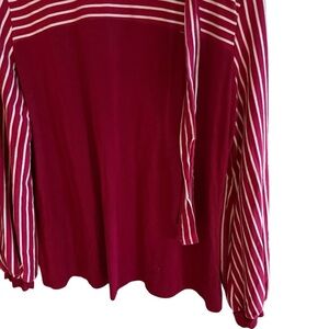 This In' Voland women's blouse is a perfect addition to your wardrobe. The red and white striped pattern, long sleeve design, and round neckline create a stylish and comfortable look. The pullover closure and tie bow accents add a touch of elegance to this casual top.