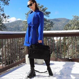 Two front pockets. Of the two front pockets one has a mesh pocket and the other also has a mesh pocket, two pen holders, and a key holder clip. Velcro closure over both of the front pockets. The inside is fully linedd in a padded and soft lining for the laptop. It zips close.