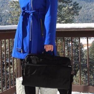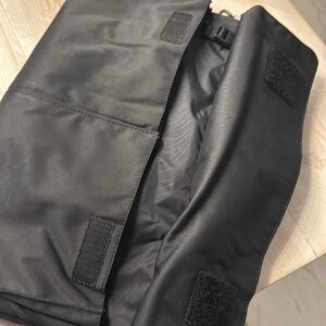 The back has one large pockett the runs the entiree side. It velcros close. Removable shoulder strap- metal has some wear. Shoulder strap is adjustable table and paddedd at the top. Bag is 27” x 11.5”