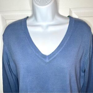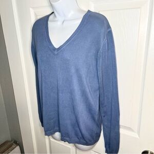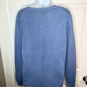 In bed with you Lived-In Look Cotton V-Neck Sweater Muted Blue Size Medium. Size missing and is estimated. See measurements. Muted blue V-neck sweater with a relaxed fit and lives in worn distressed look. Purposefully lived-in like a comfy lounge sweater you might wear around the house or to do some chores. Long sleeves. This garment was hand tinted with an old technique that makes each garment unique. Green tinted on inside which shows through some on outside. The non-uniform colors and any imperfections are not to be considered a defect but original features of the materal treated. 100% Cotton breathable fabric, lightweight. Can also be worn inside out for a different worn look. Gently used Good Preowned condition with imperfections- see note above and photos. No holes and marks are part of the garments originality. Size estimated