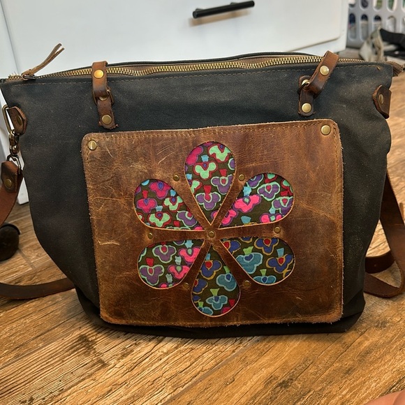 In blue black waxed canvas tote with leather pocket and flower handles. Great condition