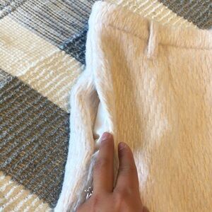 This is an In the Style women’s fuzzy mini skirt. It has pockets and belt loops. It zips closed. It is an off white cream color. It says it is a size 14, but it definitely looks small for a 14. Check the measurements in the pictures. It is in good condition.