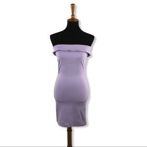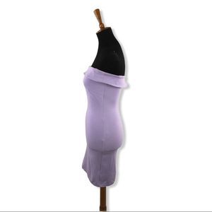 Beautiful of the shoulder lavender dress by and all of you awesomeness TV. Very thick material. Hugs the body very nicely. Has a minor stain on the left bottom. Looks like a make up stain from someone trying it on should come off after wash.