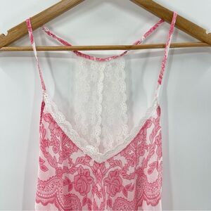 Elegant chemise with delicate lace detailing. Features a pink floral pattern on a white background. Perfect for a comfortable and stylish night.