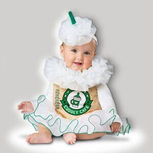 In Character Order up! This cuddly café includes a frothy collar laid over a coffee cup dress. Extra whip? No problem! Her adorable headpiece is the icing on top complete with straw. Shes a triple order of cuteness! Costume includes dress collar headpiece. As an added bonus this costume features leg snaps for easy diaper change. Packaging: Packaged in a hanging vinyl snap bag with color photo insert.