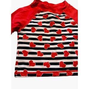 InGear Infant Girls rash guard swim set, size 12 months. Features a long sleeve top, ruffle bottom with hearts and stripes design. From a smoke-free home.