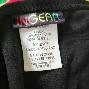 Stand out poolside or at the beach with this vibrant InGear tankini swimsuit set in size Medium. The top features bold red, yellow, and green diagonal stripes with a black trim and halter tie neckline. Paired with solid black bottoms with adjustable side ties for a customizable fit.