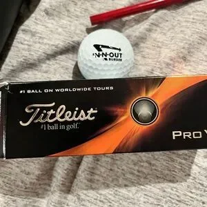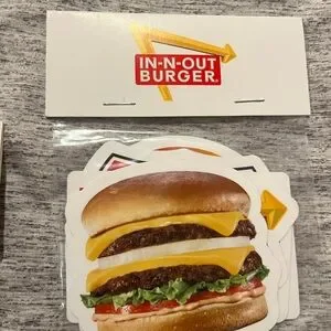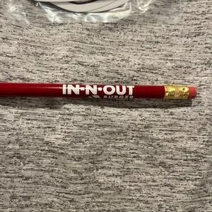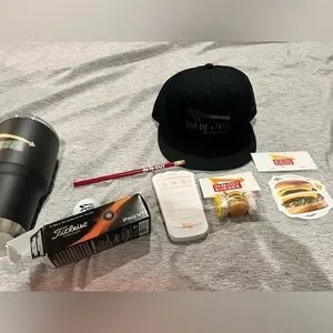 Bundle of NWOT In-N-Out items. Black hat. Stickers. Pencil. Erasers. Post-Its. 3 golf balls. Stainless mug.