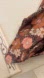 Stylish swimsuit with a floral pattern. Features shades of brown, orange, and pink.