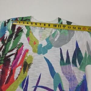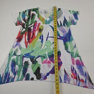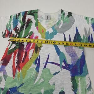 Color/Pattern: White base with multicolor abstract botanical print (greens, blues, purples, reds)