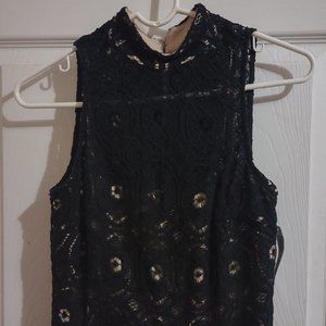 sleeveless, high neck zip up in back with hook & eye closesure. Black crochet lace over a nude slip. Knee length.