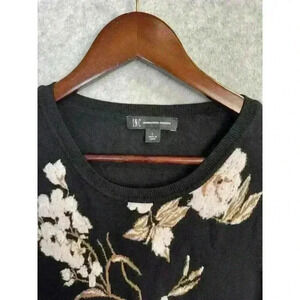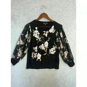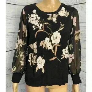 Inc International Concepts Floral Sheer-Sleeve Chiffon Sweater Size: L Black EUC