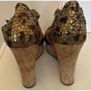 Inc International Concepts Sequin Cork Wedge Sandals 8.5M Brown Gold Ankle Strap