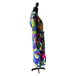 This item consists of a long, flowing wrap tie jacket/duster with a vibrant, multicolored abstract floral pattern. The base color of the dress is a deep royal blue, and the design features bold swirls, leaves, and flower-like shapes in shades of pink, green, yellow, and red. The dress has long sleeves with gathered cuffs and a waist tie that cinches the dress for a flattering silhouette. The overall look is stylish, statement-making, and perfect for a fashionable yet elegant appearance.