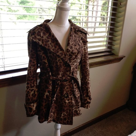 Size S leopard print jacket. Length of jacket from shoulder is approx 28". Double breasted and belted. Hardly worn.